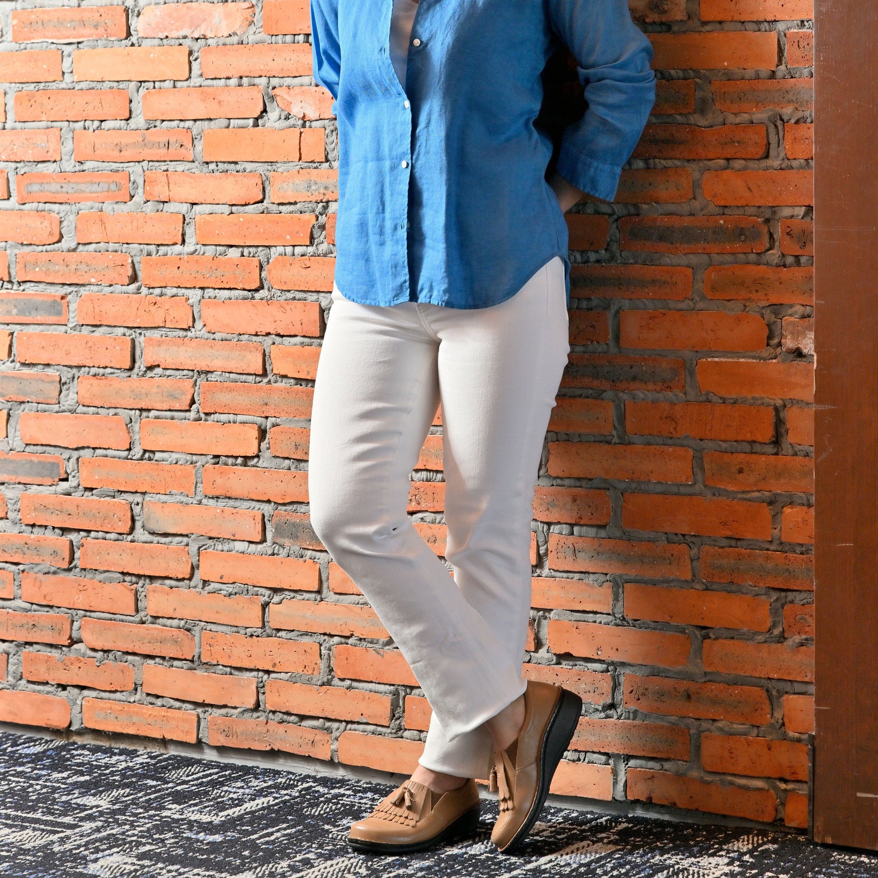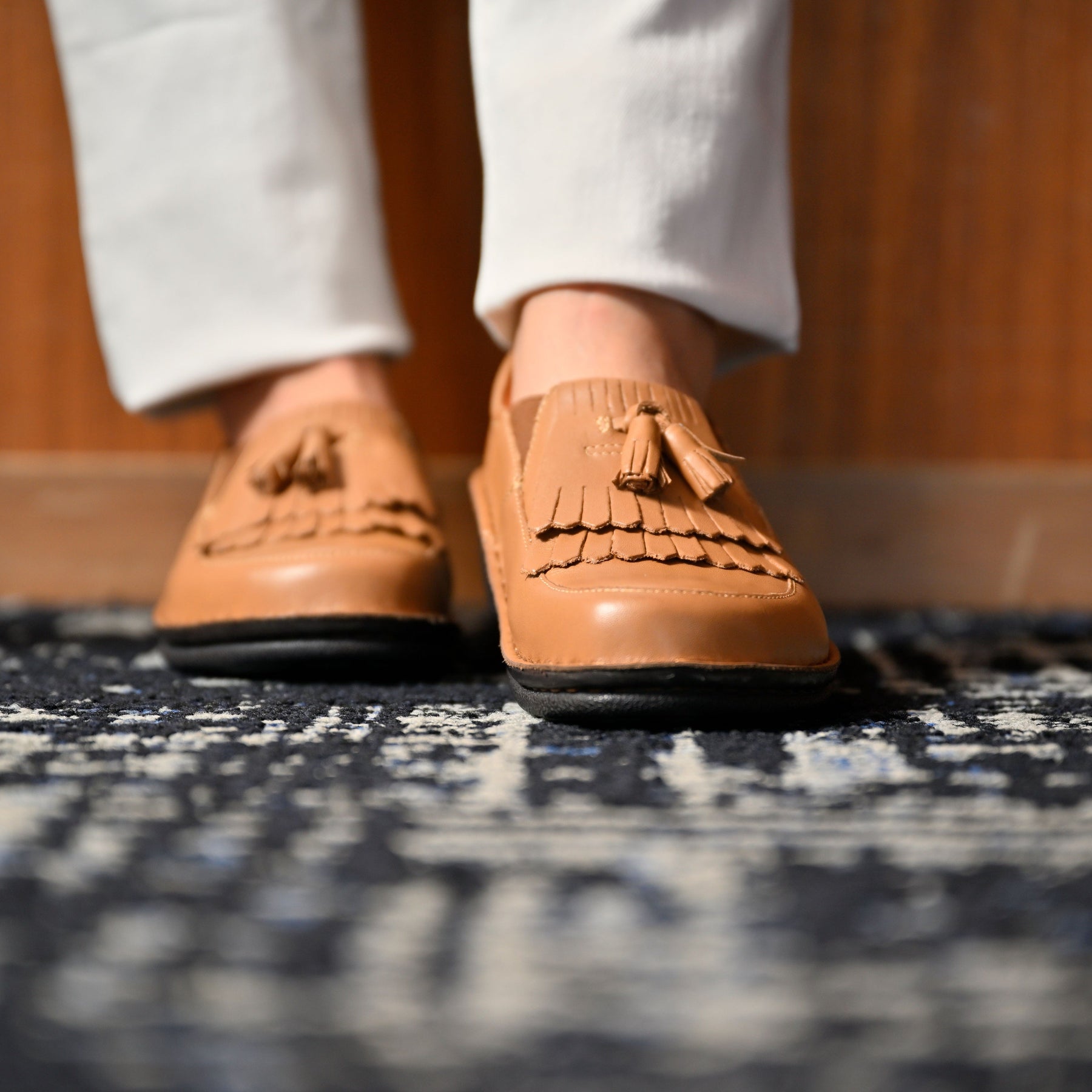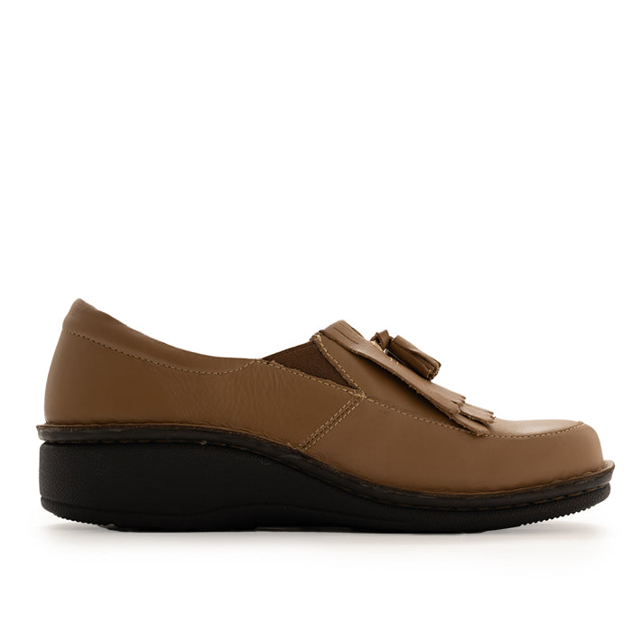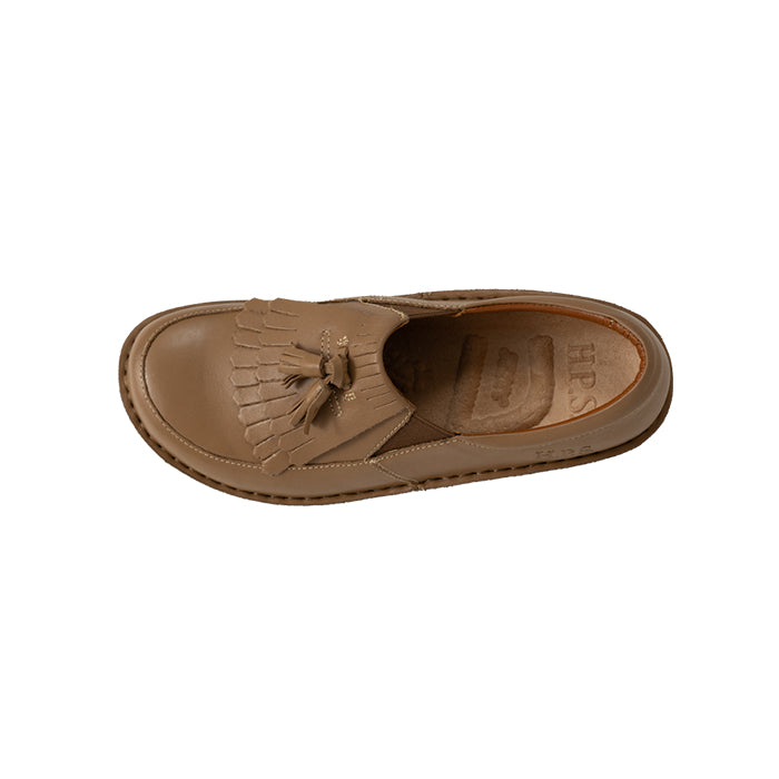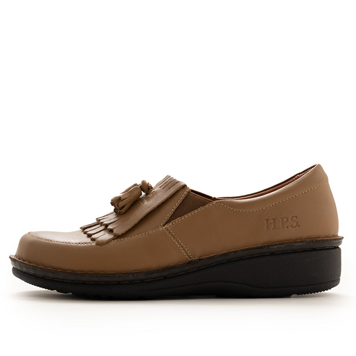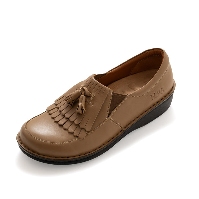 タッセル付きのスリッポンで、脱ぎはぎがしやすく甲のところでしっかりと止まって、指が自由に動き足入れも良く、歩きやすい。