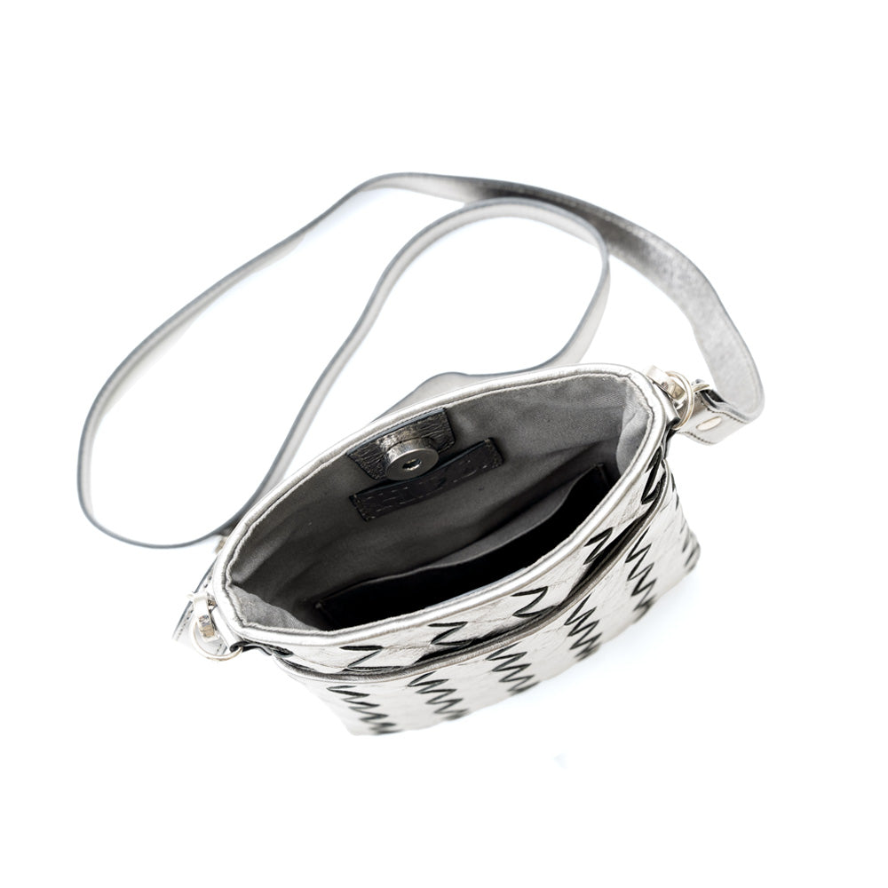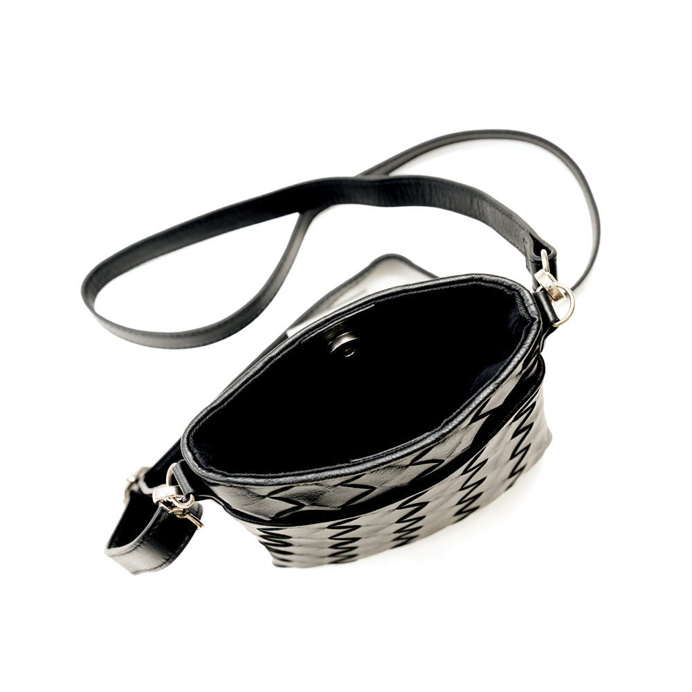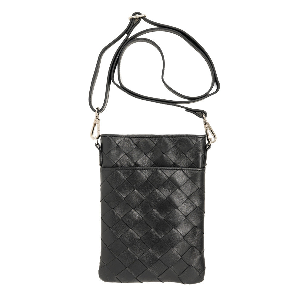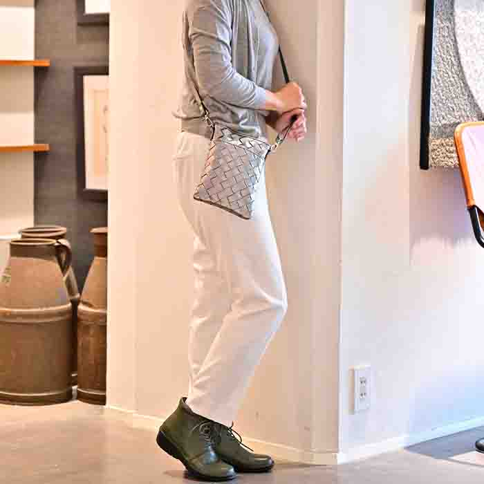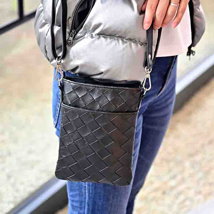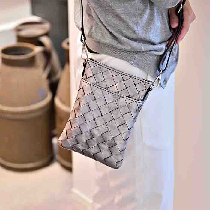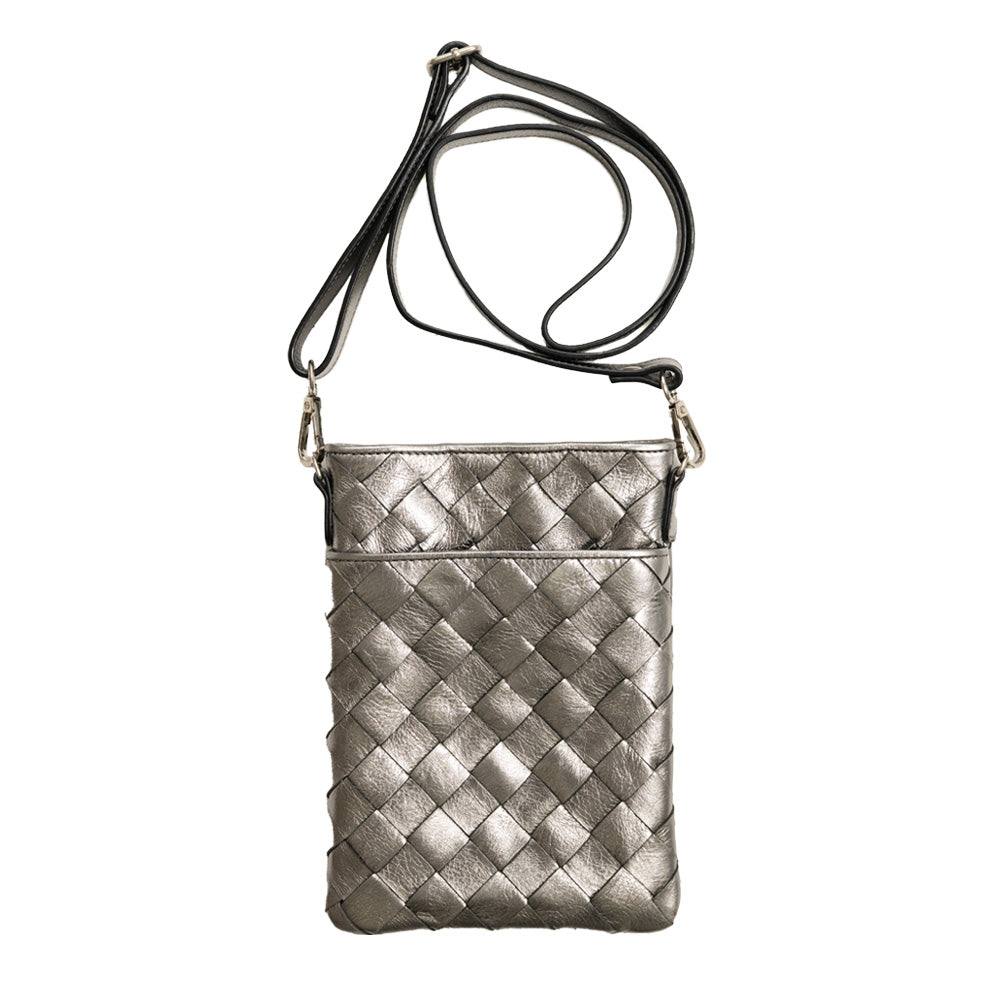 少し大きめのメッシュで、モダンで高級感を感じるメッシュ素材のスマホショルダー。バングラデシュの職人の手によって、丁寧に編み込んで作られています。前面のポケットはスマートフォン、バッグ本体は長財布が入るサイズです。内側にもポケットが一つあります。ガンメタは光りすぎないので、季節を問わずに使えるカラーです。