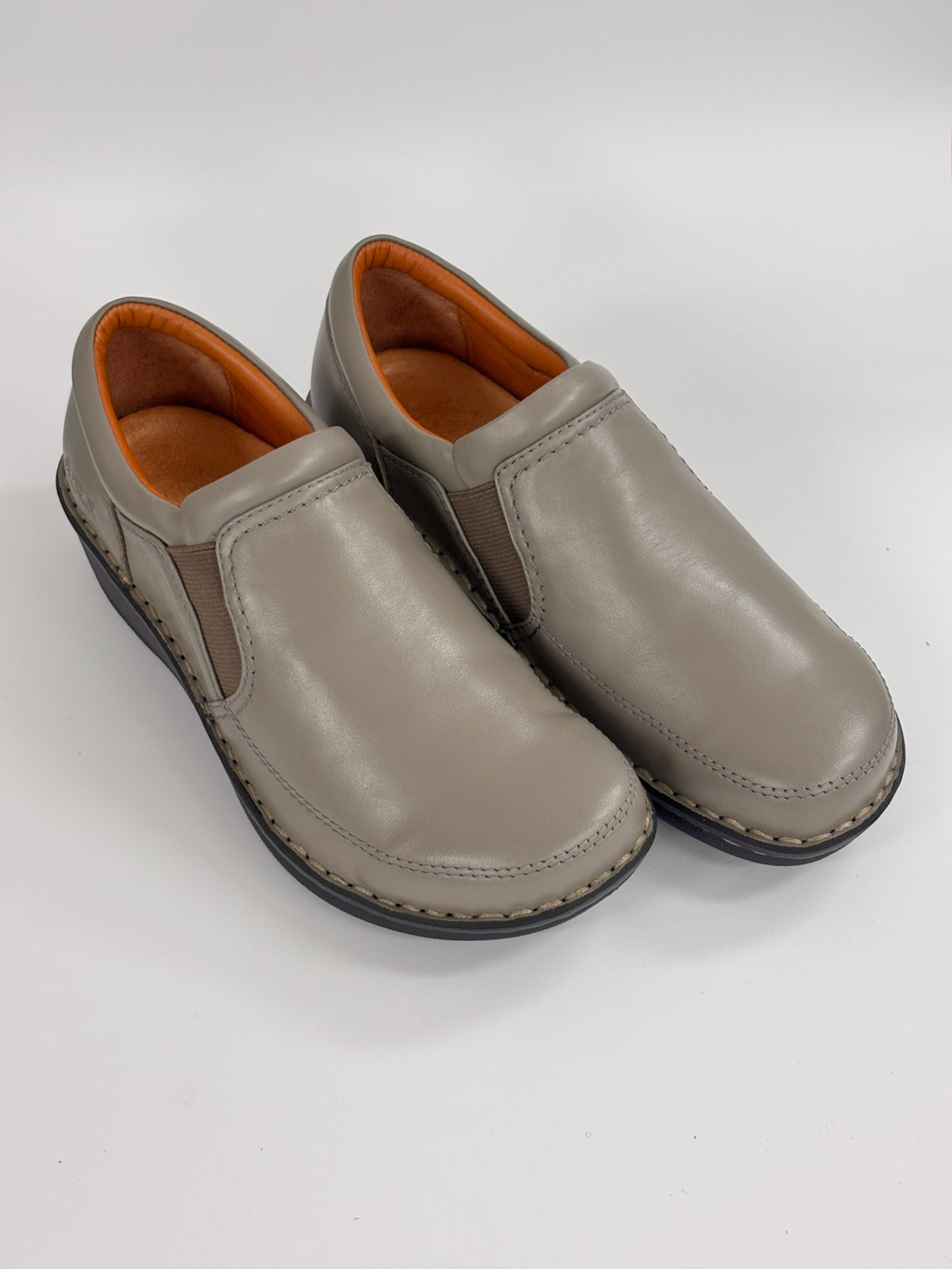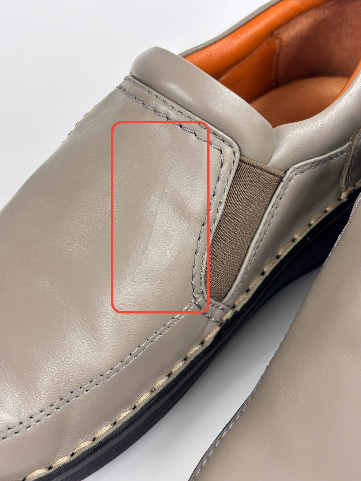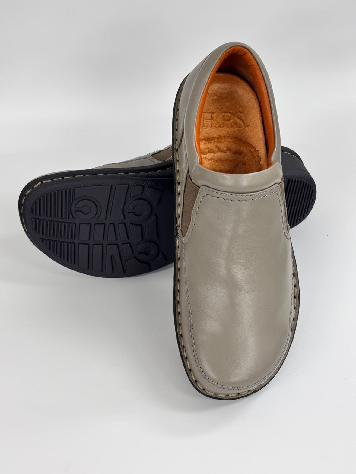 H.P.S.定番のサイドゴアデザイン足首周りのスポンジは、コロコロして足に触らないように平らなものにしています。足入れだけでなく、足首周りにも配慮したデザインです。両サイドのゴムでスッと履けて脱ぎ履き楽チン。甲部分は1枚の革で出来ているので外反母趾にも優しいデザインになっています。